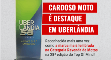 A Cardoso Moto foi reconhecida mais uma vez como a marca mais lembrada na categoria Revenda de Motos, na 28ª edição do Top Of Mind Uberlândia S.A.